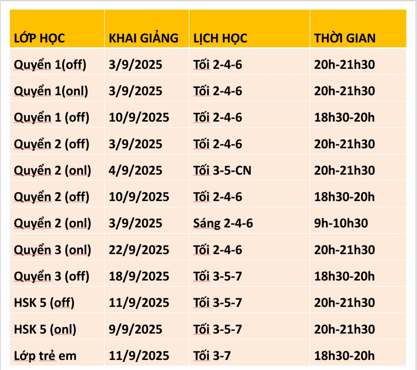 LỊCH KHAI GIẢNG LỚP TIẾNG TRUNG THÁNG 9/2025